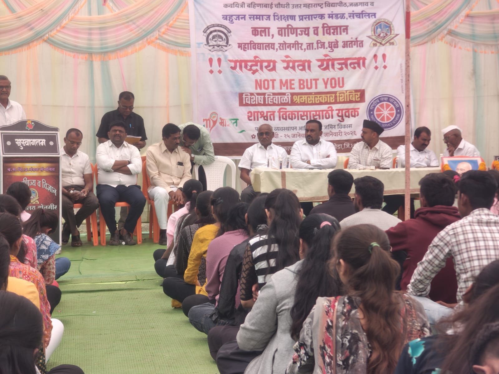 दिनांक १५जानेवारी ते २१ जानेवारी २०२६ या कालावधी सात दिवसीय शिबिराचा समारोप प्रसंगी कवयित्री बहिणाबाई चौधरी उत्तर महाराष्ट्र विद्यापीठ,जळगाव चे माजी व्यवस्थापन परिषदेचे सदस्य डॉ.नितीन बारी यांच्या हस्ते करण्यात आला. प्रसंगी अध्यक्ष महाविद्यालयाचे प्रभारी प्राचार्य डॉ.आर.जी.खैरनार उपस्थित होते.तसेच उपाध्यक्ष श्री.दंगल वामन धनगर,संस्थेचे संचालक श्री.जी.के.तांबट,श्री. मुरलीधर मांगा चौधरी,श्री. गौरव कासार,श्री.लखन रुपनर,श्री.पंकज कदम, श्री.भटु राजे,श्री.एम.टी. गुजर,डॉ.गौरव पारेख, पत्रकार श्री.निखिल जैन, श्री.प्रवीण शिरसाठ आदी मान्यवर मंचावर उपस्थित होते.